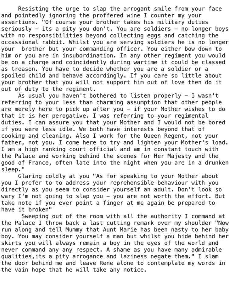 “So how did your debriefing go with father? You know…I really ought to just burn that bloody diary of Raoul’s” waving a fist with my empty hand “Every opportunity he gets he’s there…scribbling down onto the pages and checking over his shoulder constantly to see if anyone is looking” shoving the remainder of the fruity pastry into my mouth and tries to scowl like father.