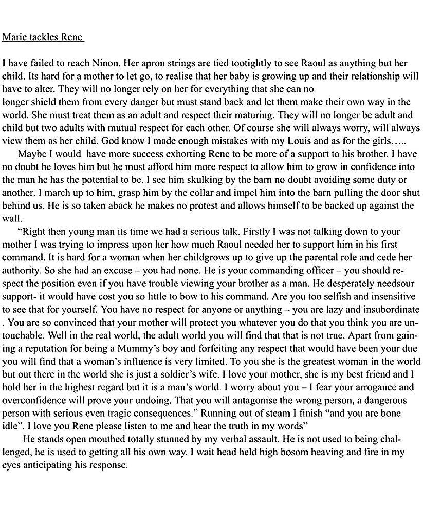 “You will ensure the barn is suitable for a further two more new recruits being sent from Paris. Both are about your age. You, however, will move back into the house and share your room again with Rene. I will not have your mother and Aunt Marie subjected to strange young men in the house. However, should any of the troop be injured, then your room is to be used as an infirmary”