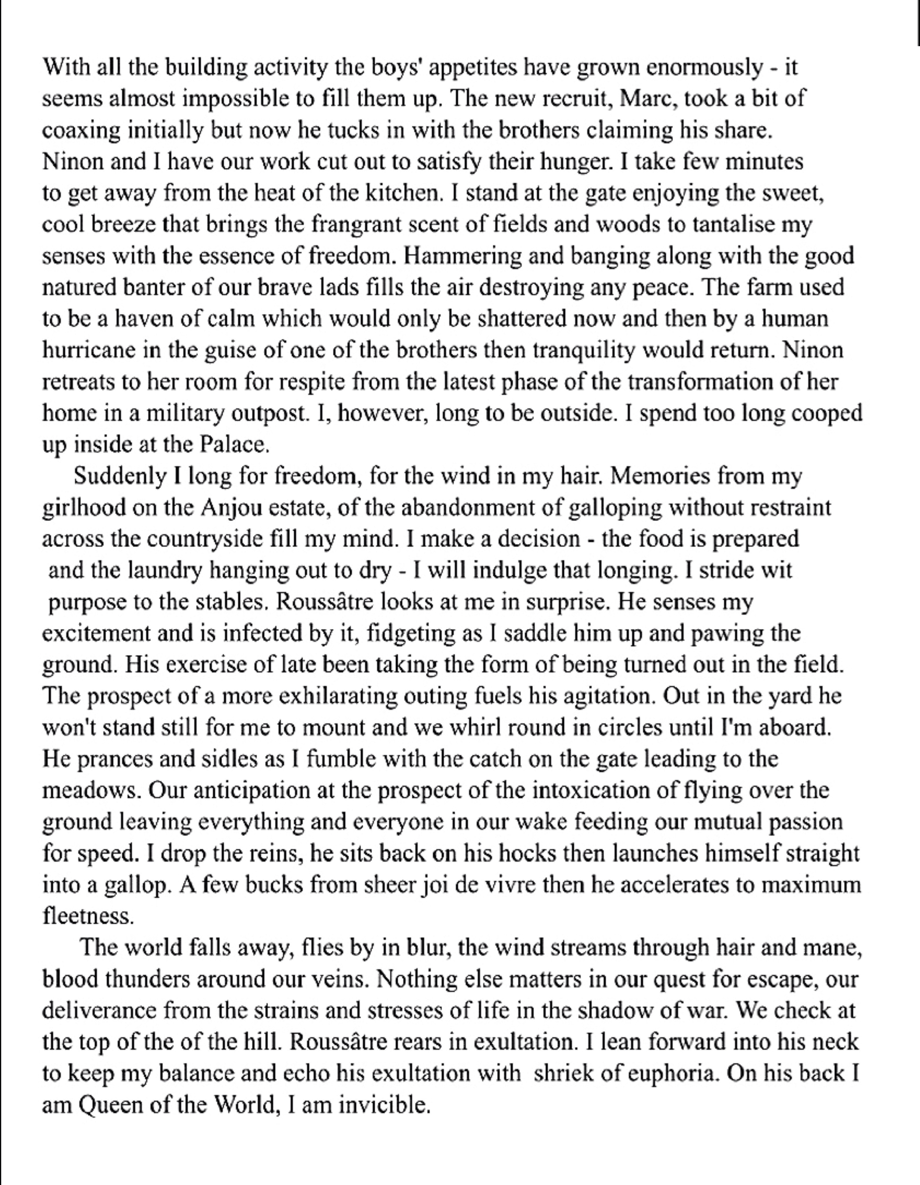 Now looking over my son again a warmth of pride threatens to overwhelm me. He is so young, but yet there is in him an intensity beyond his years. I swallow as I think that should I not return from the war then both Ninon and Marie will be safe, or are safe as I can make them under the protection of the two sons I love so much. Now as emotions start to surface I offer Raoul a formal handshake.
