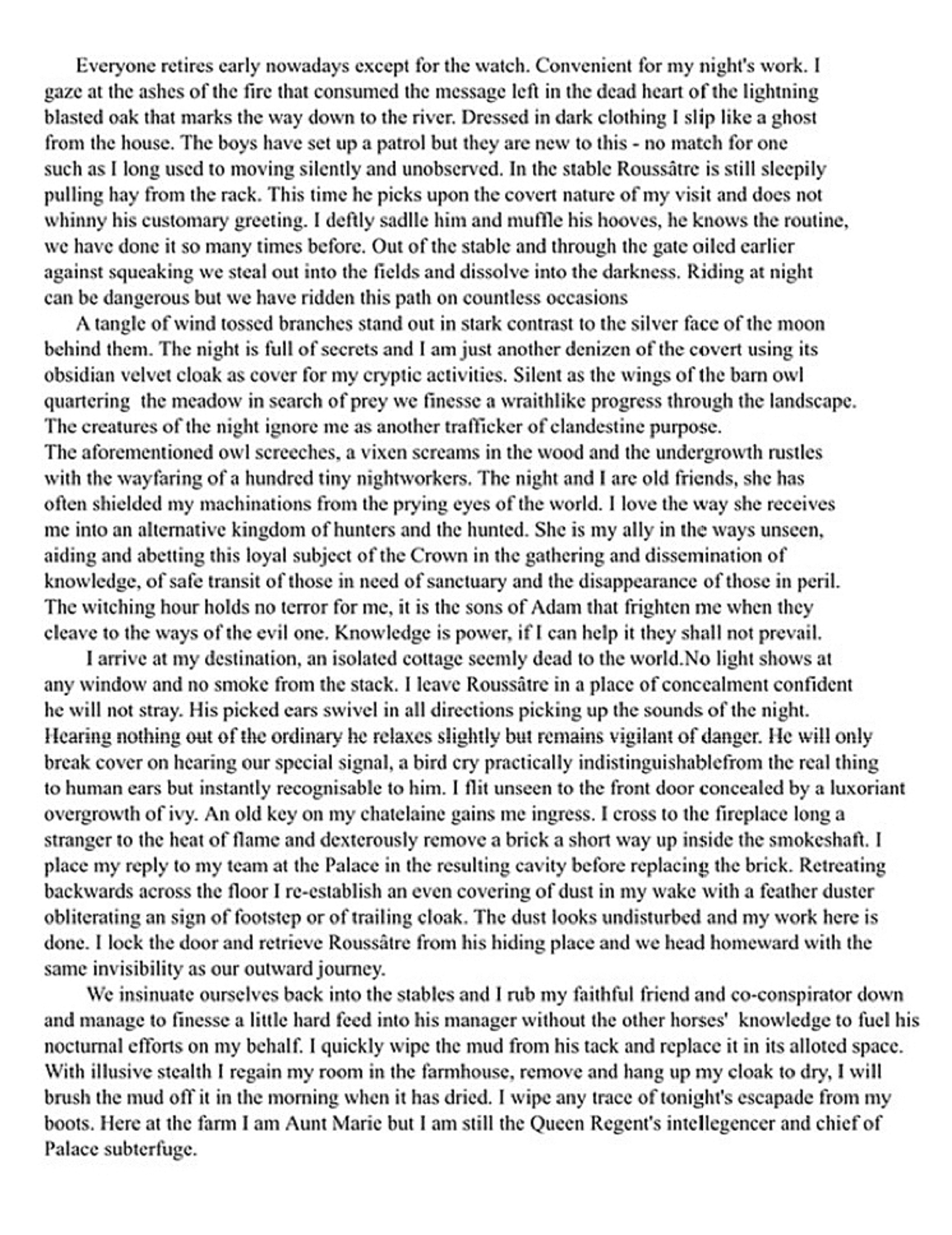 With a warmth of heart and post-coital mellow I seek out Raoul to discuss his management of the farm out post. Still leisurely tucking my shirt back into my breeches I see his expectant face, bright eyed and full of innocent wonderment. I feel unnerved wondering if he knows of my true purpose with his mother but preferring as always to duck the issue of adult relationships.